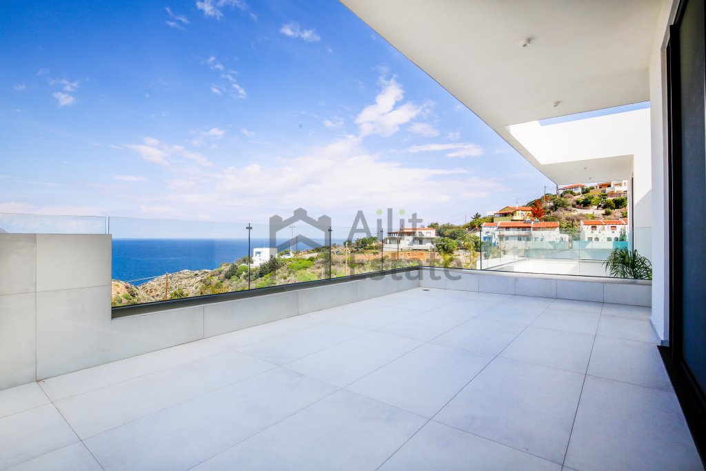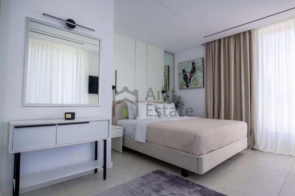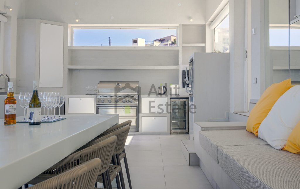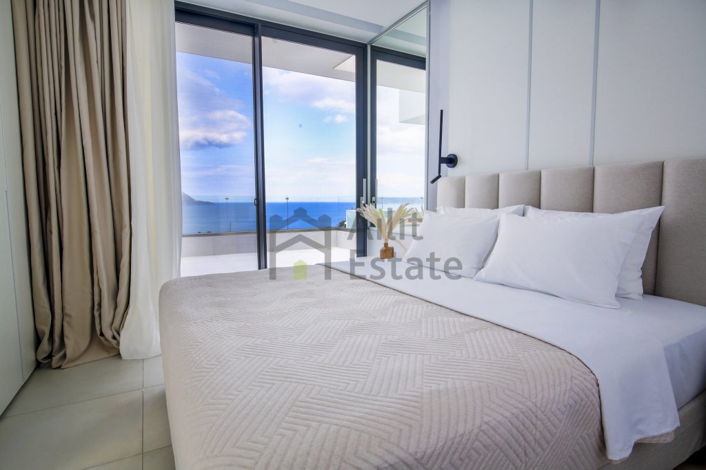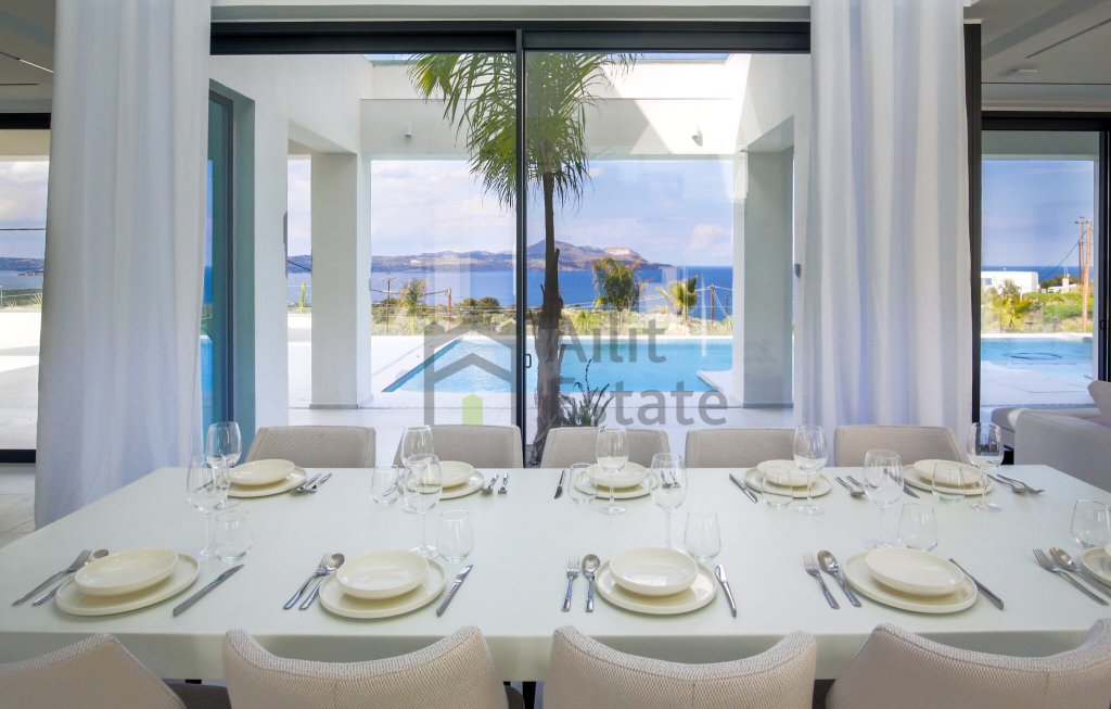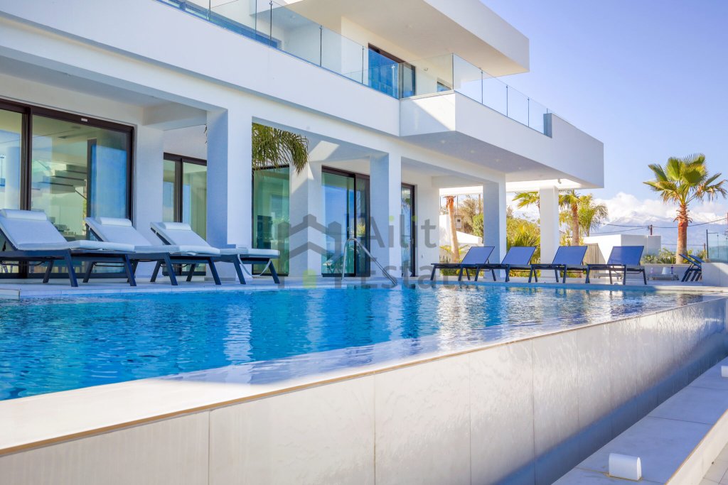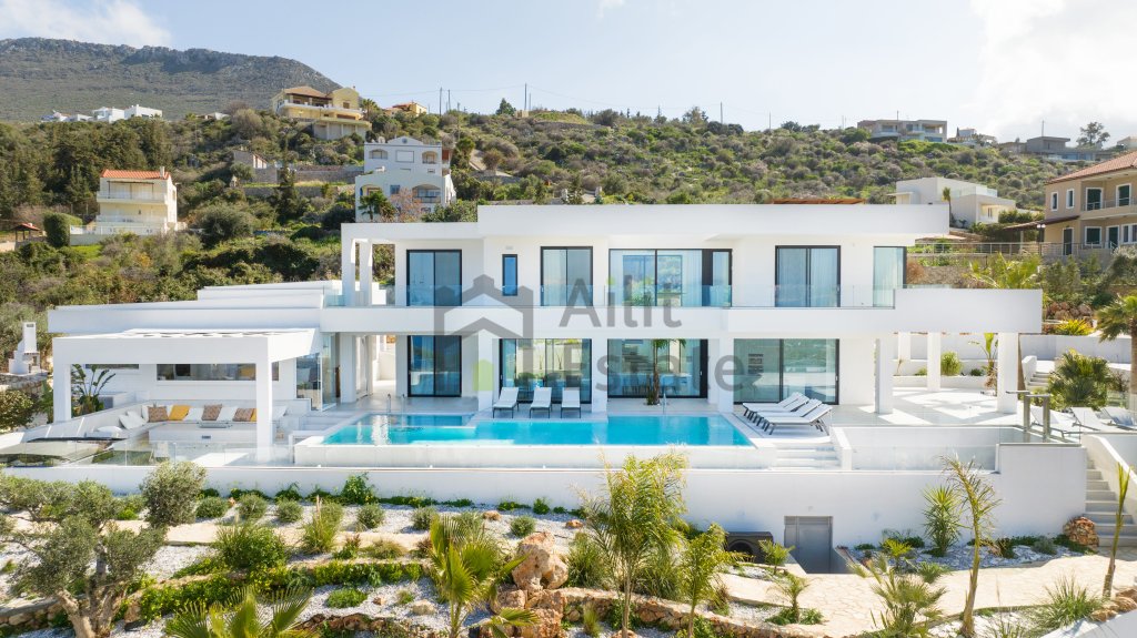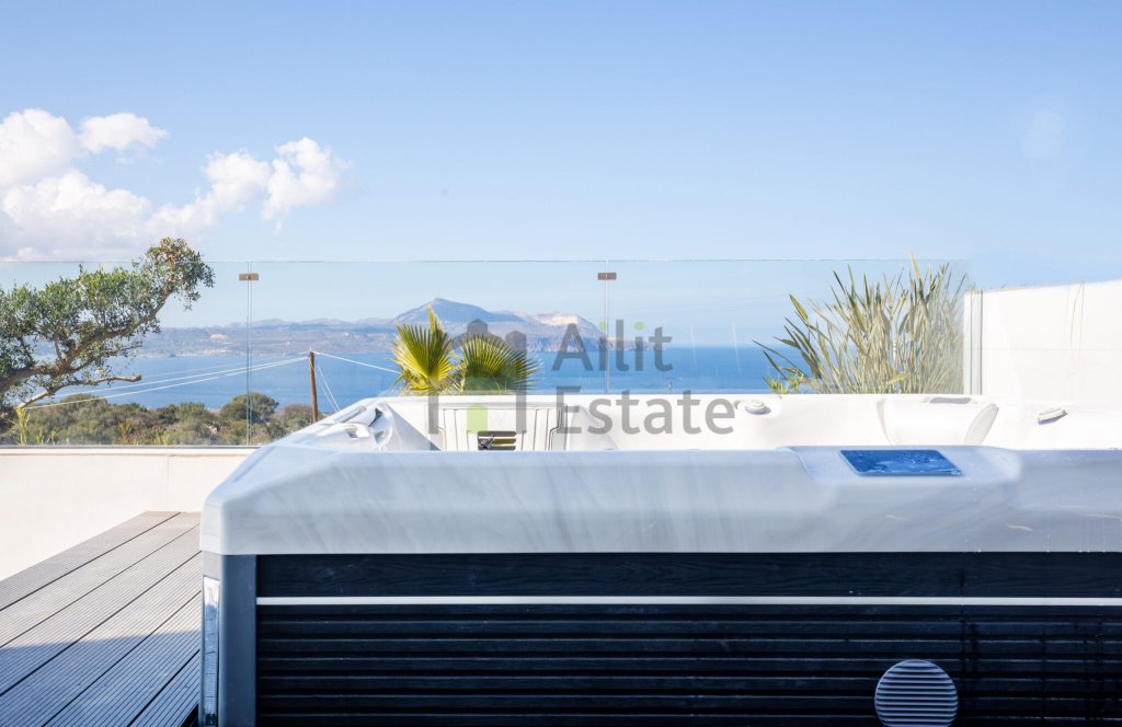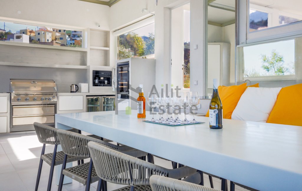 Villa Omorfi combines elegant design with advanced technology for maximum comfort. The spacious living room with high ceilings and panoramic A++ windows flows seamlessly into the stylish kitchen equipped with premium Miele appliances. All 5 bedrooms have en-suite bathrooms, sea views and access to a spacious 100 sqm balcony.